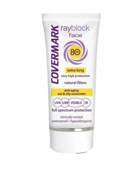 Rayblock Face SPF 80 de Covermark es un foto-protector facial con filtros naturales Foto-estables, extremadamente seguros frente al UVA/UVB/HE VISIBLE/ IR, que dura al menos 6 horas después de cada aplicación. Efecto “total-block” de Amplio espectro. Ideal para grandes exposiciones solares (campo, buceo, nieve, etc) o pieles extremadamente sensibles al sol. Resulta un protector solar ideal para el mar y la ciudad con un ligero toque de color y permanece incluso cuando nadamos o transpiramos. Imprescindible como protección en los tratamientos de manchas en la piel. Clínicamente testados. Enriquecidos con Vitamina C (acción anti-envejecimiento). No pica los ojos.